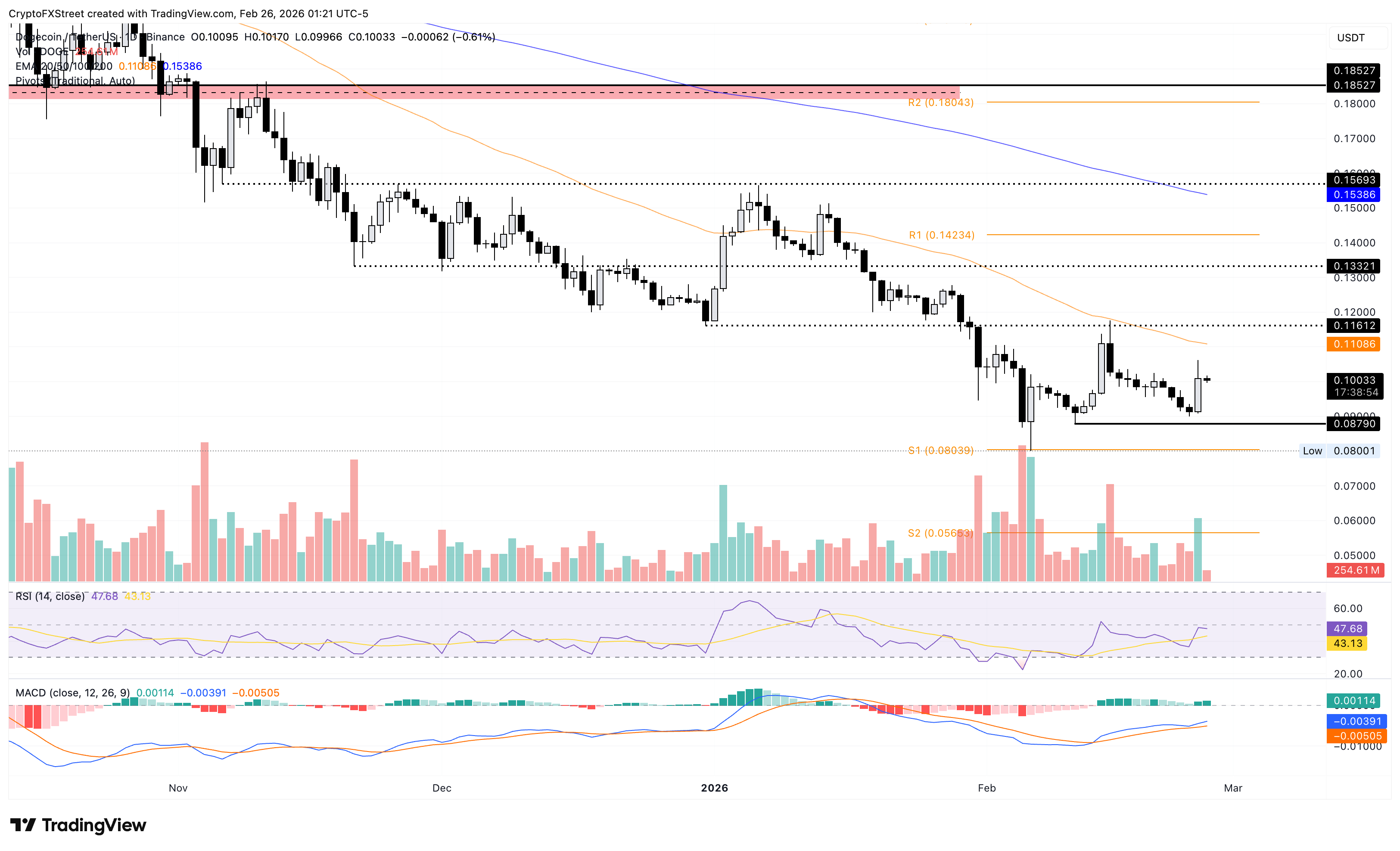 Dogecoin cotiza alrededor de 0.1000$ en el momento de la publicación el jueves, manteniendo las ganancias del 10% del día anterior después de que la EMA de 50 días cerca de 0.1108$ limitara la recuperación intradía.