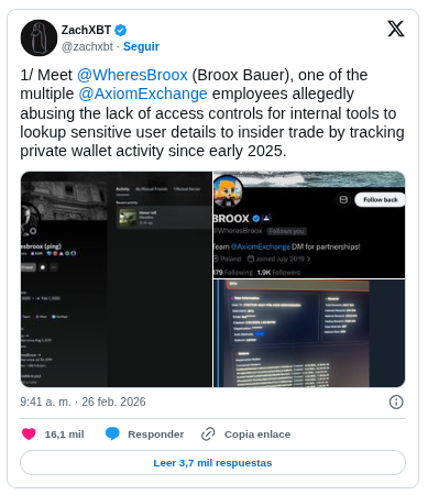 El 26 de febrero de 2026, el reconocido investigador on-chain ZachXBT publicó una exhaustiva investigación que ha generado conmoción en el mundo cripto. Acusó a un empleado de Axiom Exchange, una plataforma de trading basada en Solana, de haber cometido insider trading sistemático mediante el abuso de herramientas internas de la compañía.