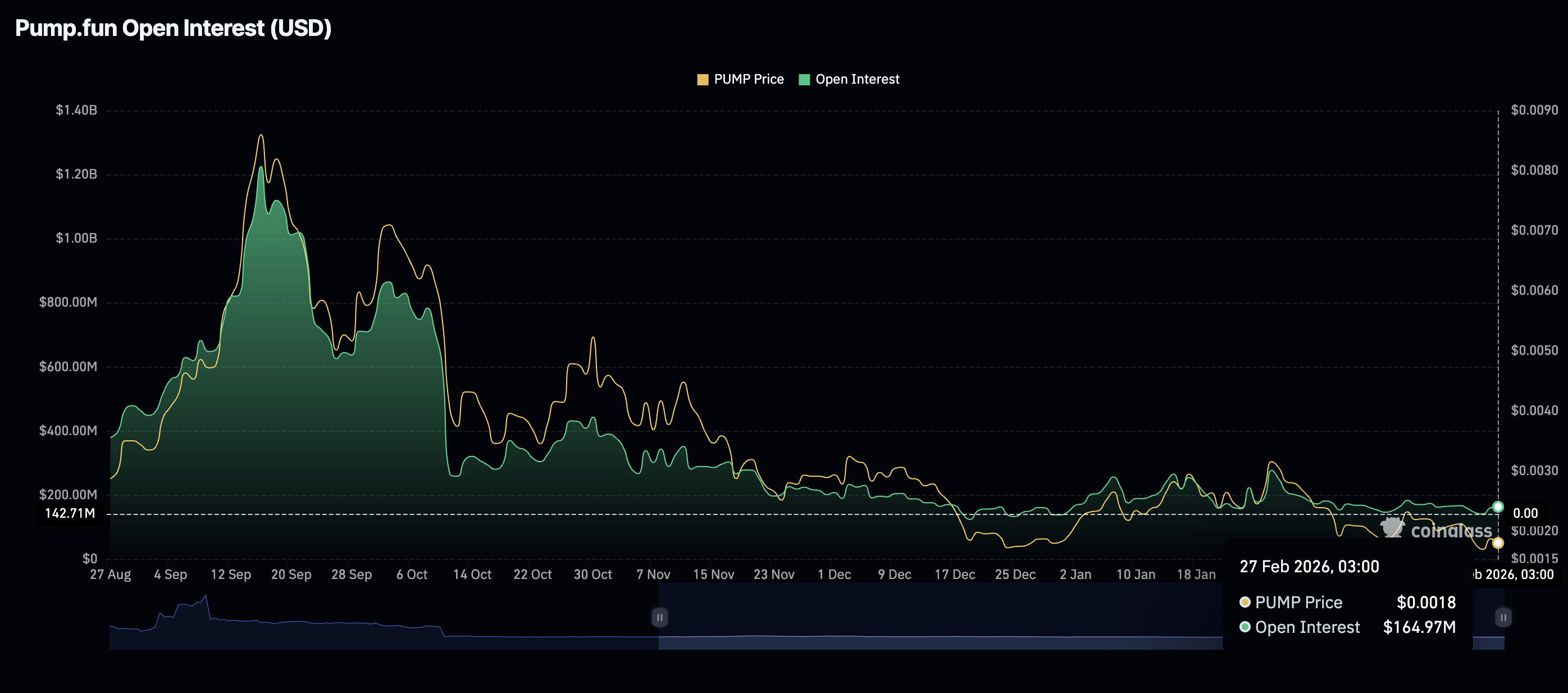 El mercado de derivados también está en retroceso, ya que el interés abierto de futuros de $PUMP (OI) se estabiliza alrededor de 165 millones de dólares el viernes. Durante las últimas dos semanas, el OI, que rastrea el valor nocional de los contratos de futuros pendientes, ha permanecido entre 142 millones de dólares y 185 millones de dólares.