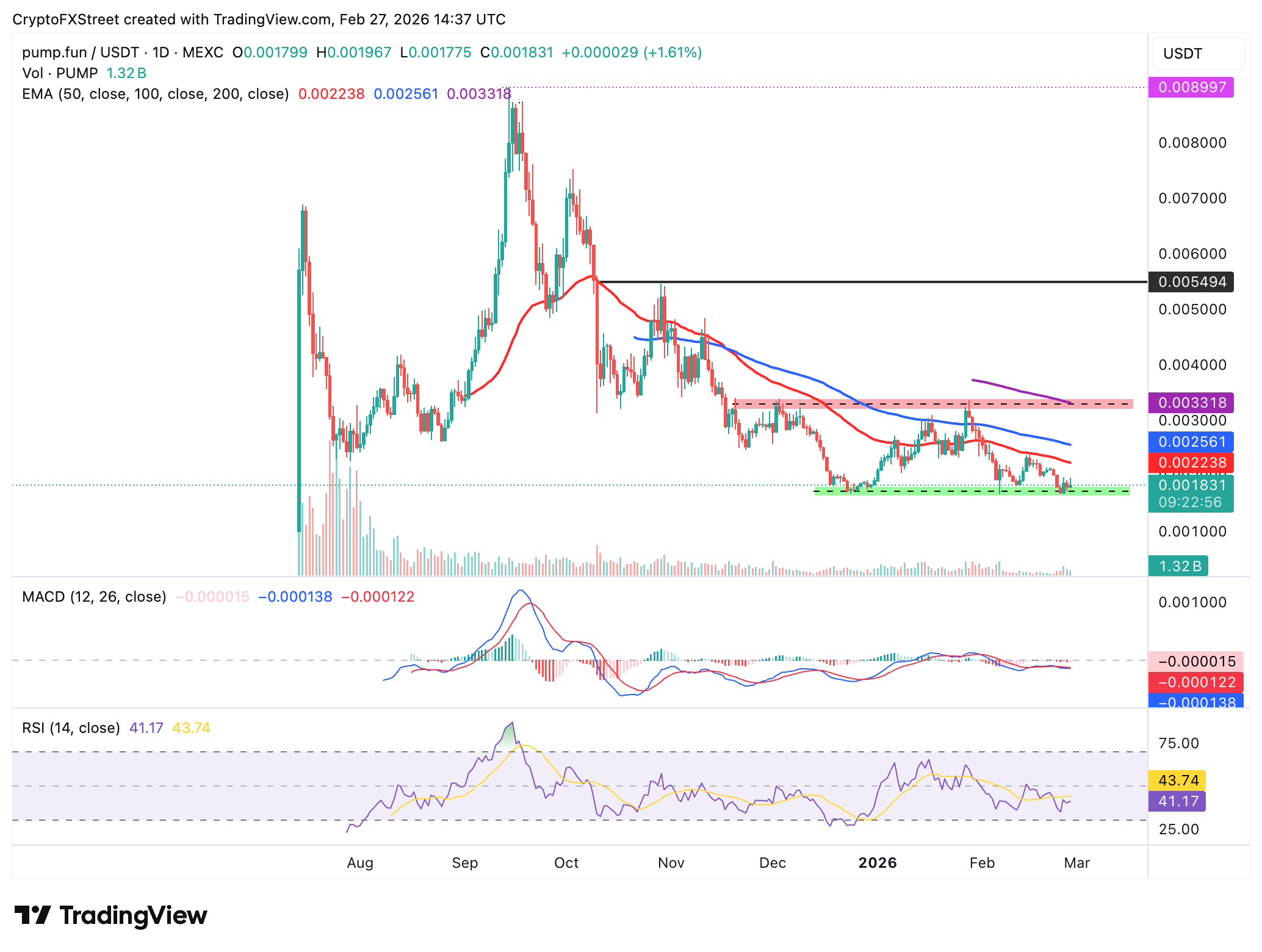 Pump.fun ($PUMP) se mantiene estable por encima de 0.0018$ en el momento de escribir este artículo el viernes, reflejando un leve aumento intradía a pesar de los vientos en contra que recortan las ganancias semanales en el mercado de criptomonedas en general.