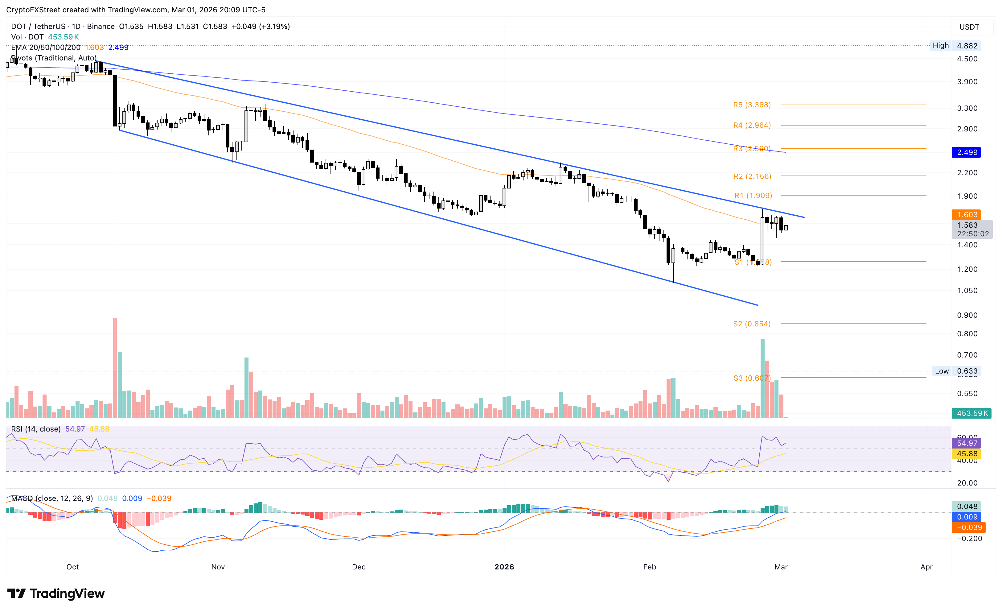 Polkadot ha subido un 3% al momento de la publicación el lunes, recuperándose tras casi un 8% de pérdidas el día anterior. $DOT se mantiene cerca de la EMA de 50 días en 1.603$, cerca de una línea de tendencia descendente que conecta los máximos del 6 de octubre y del 13 de enero, que forma parte de un patrón más amplio de cuña descendente ampliada.