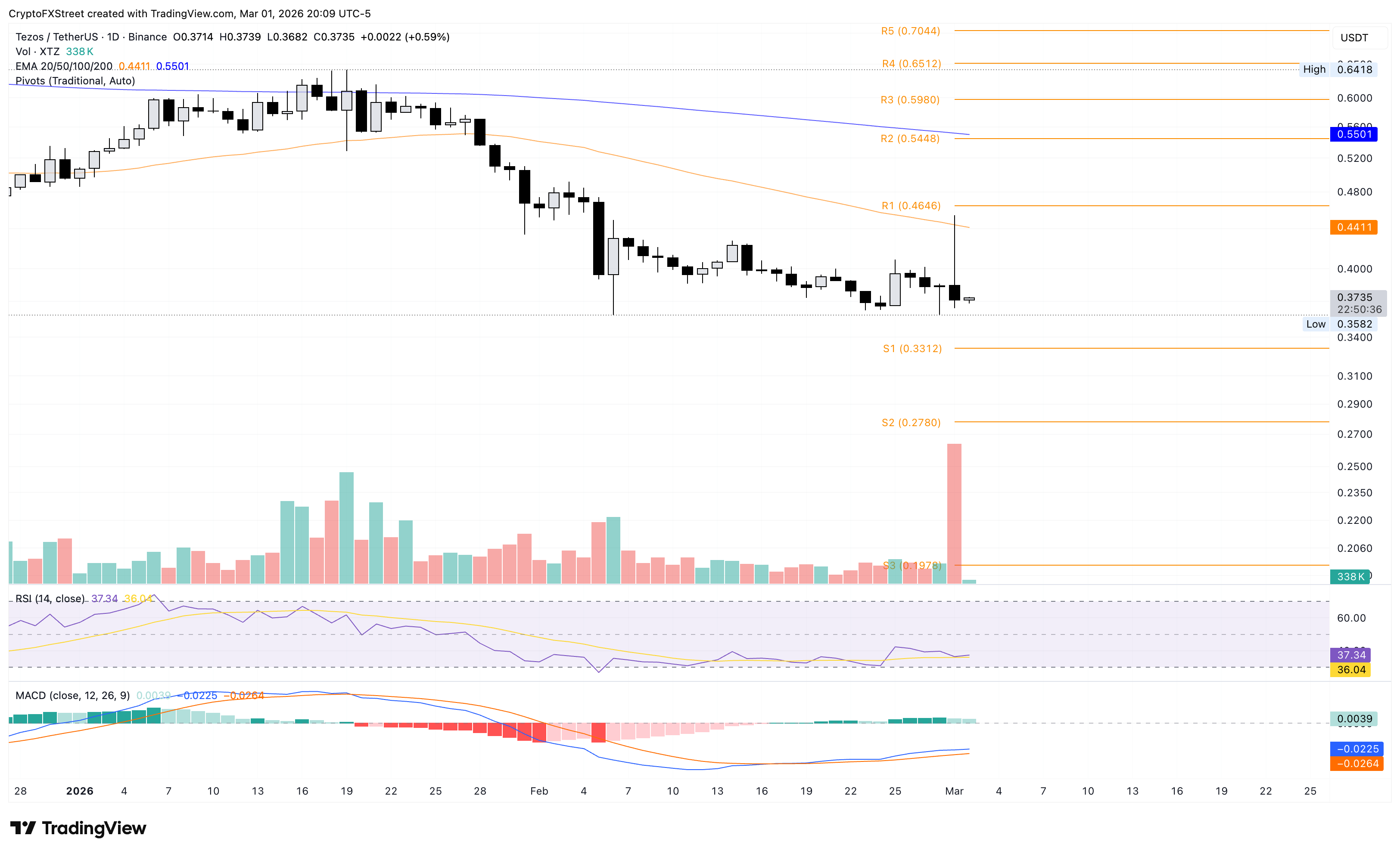 Tezos cayó más del 3% el domingo, ya que la media móvil exponencial (EMA) de 50 días limitó las ganancias intradía. Al momento de escribir, $XTZ se negocia por debajo de 0.40$ el lunes, acercándose al mínimo del 6 de febrero en 0.3582$.