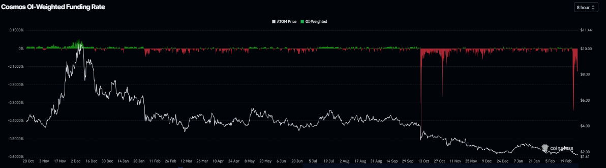 Los datos de derivados para Cosmos Hub también apoyan una perspectiva bajista. Los datos de tasa de financiación ponderada por OI de Coinglass muestran que el número de traders que apuestan a que el precio de $ATOM caerá más es mayor que aquellos que anticipan un aumento de precio. La métrica se volvió negativa el jueves y se sitúa en -0.127% el lunes, indicando que los cortos están pagando a los largos y sugiriendo un sentimiento bajista hacia $ATOM.