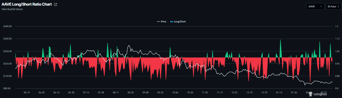 Además, la relación larga-corta de Aave se sitúa en 0,97 el martes. Esta relación por debajo de 1 indica un sentimiento bajista, ya que los operadores están apostando a que el precio de Aave caerá.