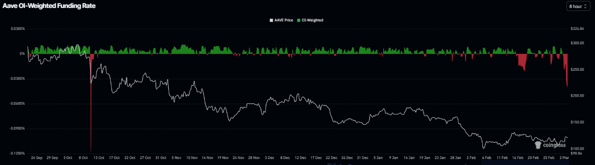 En el lado de los derivados, los datos de tasas de financiación de CoinGlass proyectan una perspectiva bajista para $AAVE. La métrica se volvió negativa el lunes y se sitúa en -0,040% el martes, el nivel más bajo desde el 11 de octubre y acercándose a los niveles vistos durante la caída del mercado del 10 de octubre. Estas tasas negativas indican que los cortos están pagando a los largos, sugiriendo un sentimiento bajista hacia $AAVE.