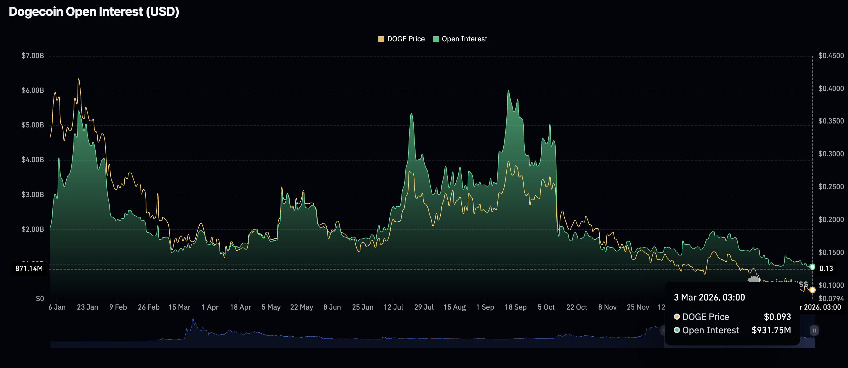 El mercado de derivados de Dogecoin refleja el sentimiento de aversión al riesgo en medio de la guerra en curso, con un interés abierto (OI) de futuros que promedia 932 millones de dólares el martes.
