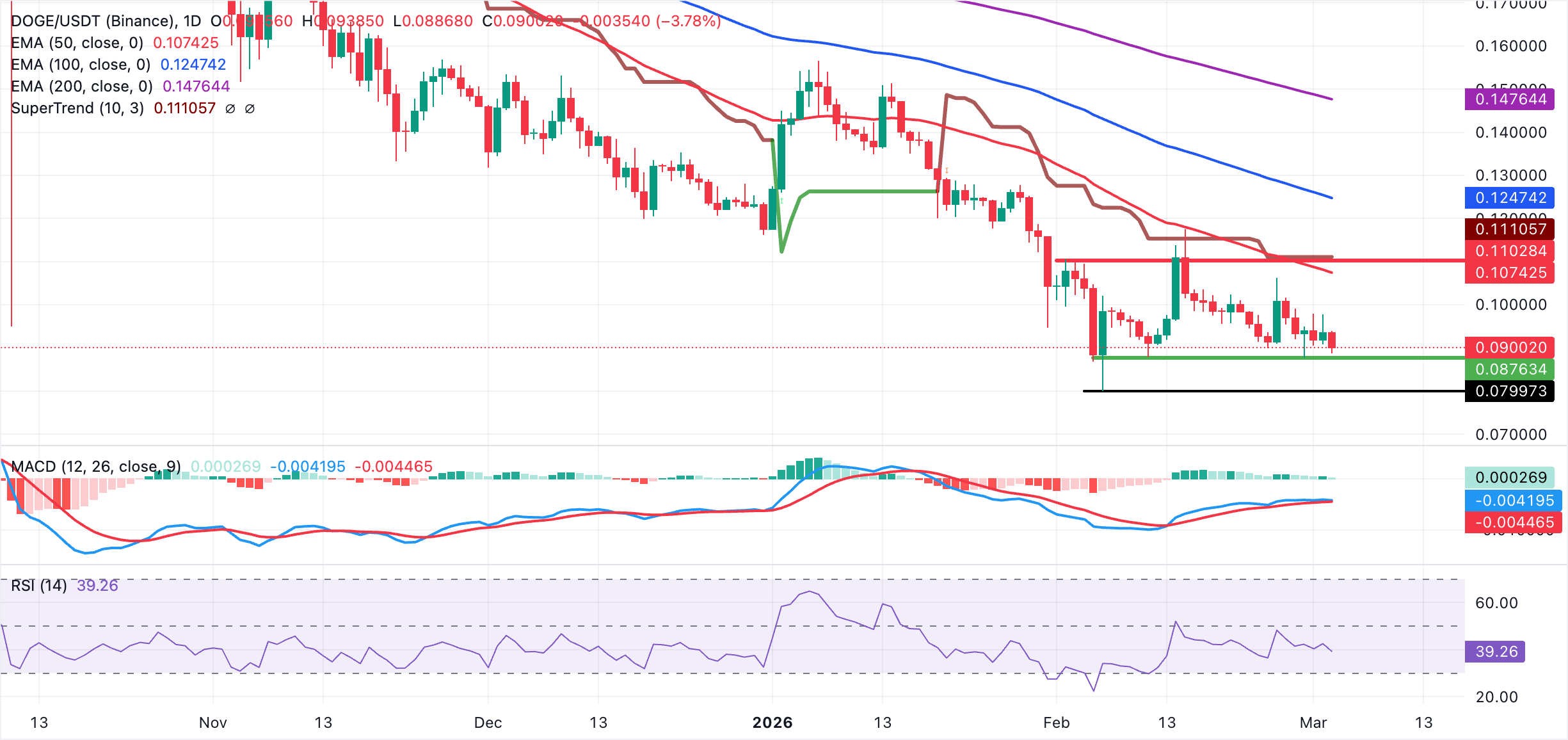 Dogecoin se está negociando alrededor de 0.090$ en medio de indicadores que tienden a ser bajistas. La moneda meme se mantiene muy por debajo de la línea SuperTrend en alrededor de 0.111$, manteniendo la presión a la baja intacta. Al mismo tiempo, las medias móviles exponenciales (EMAs) de 50 días, 100 días y 200 días se agrupan por encima de 0.107$ y descienden, reforzando una tendencia bajista dominante a medio plazo y limitando los intentos de recuperación.