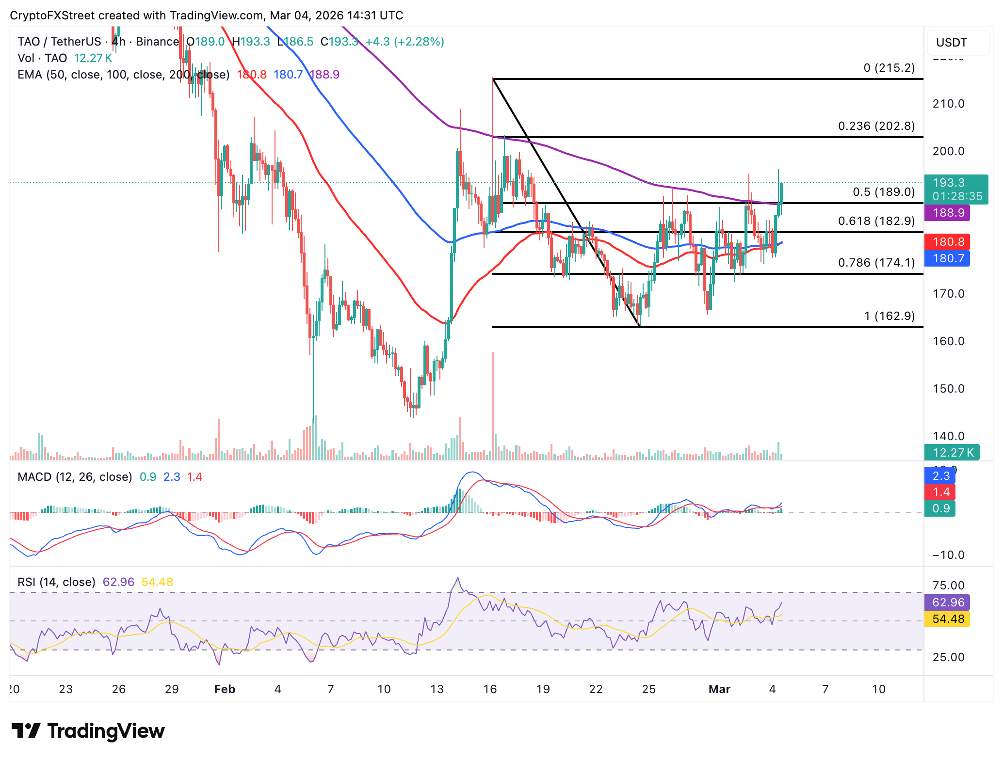 Bittensor está subiendo por encima del grupo de medias móviles exponenciales (EMAs) de 50, 100 y 200 que se sitúan entre 181 $ y 189 $ en el gráfico de 4 horas. La EMA de 200 actúa como soporte inmediato mientras los toros apuntan a una extensión de la recuperación hacia el umbral psicológico de 200 $.