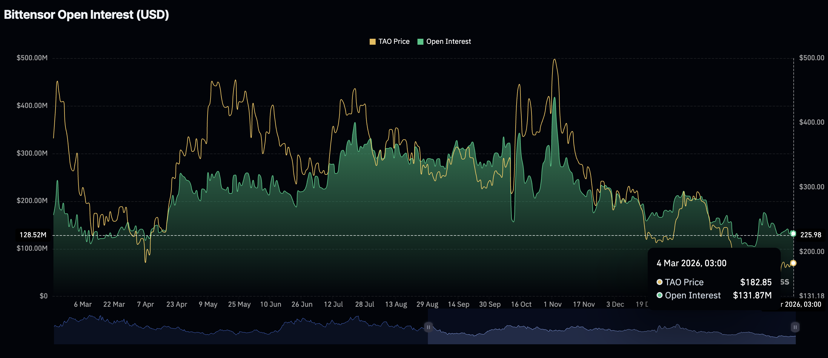 El mercado de derivados de Bittensor ha extendido la tendencia a la baja, ya que el interés abierto de futuros (OI) cae a 132 millones de dólares el miércoles, desde 138 millones de dólares el día anterior. Los intentos de estabilizar la tendencia al alza se estancaron, con el OI alcanzando un máximo de 176 millones de dólares en febrero.