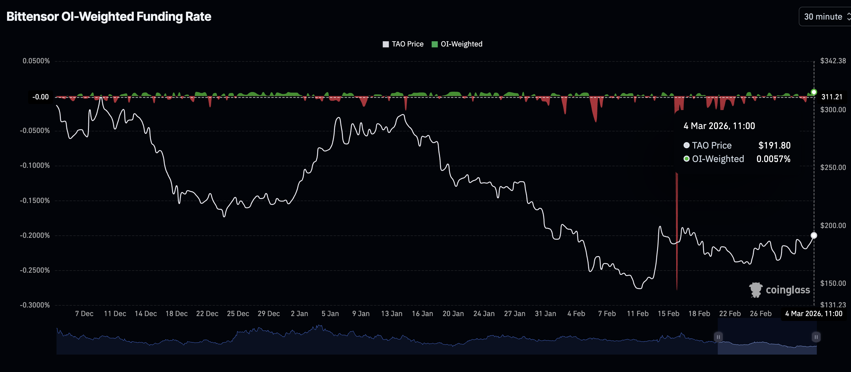 Mirando hacia atrás, los datos de CoinGlass muestran que el OI alcanzó un récord de 418 millones de dólares en noviembre, coincidiendo con el aumento de $TAO a 539 $. Si los minoristas permanecen al margen, señalando que los operadores carecen de confianza en el token de IA, la recuperación en curso podría perder impulso, desencadenando una corrección.