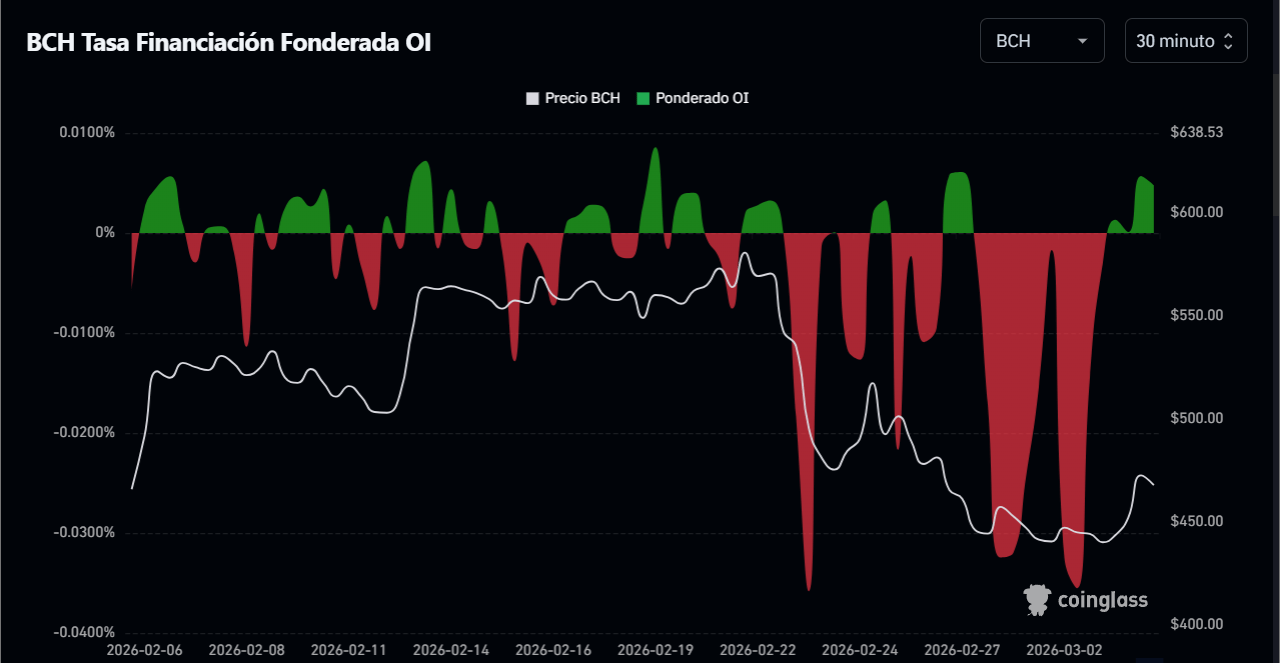 El gráfico de funding rates de Bitcoin Cash ($BCH) muestra un cambio relevante en el posicionamiento del mercado durante los últimos días. Entre finales de febrero y el 2 de marzo, las tasas de financiación permanecieron mayormente en terreno negativo, alcanzando niveles cercanos a -0,035%. Esto reflejaba un claro predominio de posiciones cortas mientras el precio descendía desde la zona de $520–$540 hasta niveles próximos a $450.
