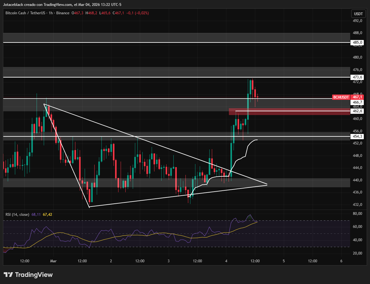 El par $BCH/$USDT muestra una ruptura clara de la fase de acumulación que se desarrolló durante los últimos días dentro de una estructura triangular. Tras varios intentos fallidos de expansión, el precio logró finalmente romper al alza esta compresión de volatilidad, impulsando un movimiento alcista que llevó al activo desde la zona de $440–$445 hasta alcanzar máximos cercanos a $472.