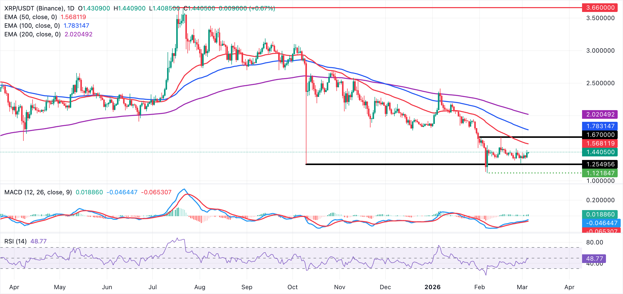 La resistencia inicial surge cerca de 1.47$, alineándose con el máximo del jueves. La EMA de 50 días en 1.57$ es una barrera más fuerte que podría restringir el precio de $XRP. En el lado negativo, el soporte inmediato se sitúa alrededor de 1.41$, el mínimo diario, con una ruptura exponiendo el siguiente objetivo bajista cerca de 1.35$.