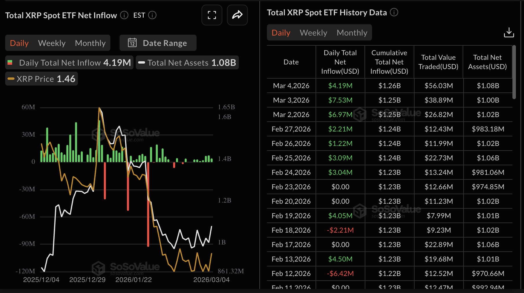Los inversores que buscan exposición a $XRP a través de fondos cotizados en bolsa (ETFs) continúan haciéndolo a pesar de la incertidumbre impulsada por la guerra en Medio Oriente. En los últimos siete días, los ETFs de $XRP al contado listados en EE.UU. han atraído entradas, con aproximadamente 4 millones de dólares registrados el miércoles. El ETF XRPC de Canary Capital representó todas las entradas, ya que la actividad se mantuvo apagada en el resto de los productos. Las entradas acumuladas aumentaron, alcanzando 1.26 mil millones de dólares el miércoles, desde 1.25 mil millones de dólares el día anterior. Los activos totales bajo gestión se mantienen por encima de 1 mil millones de dólares, según datos de SoSoValue.