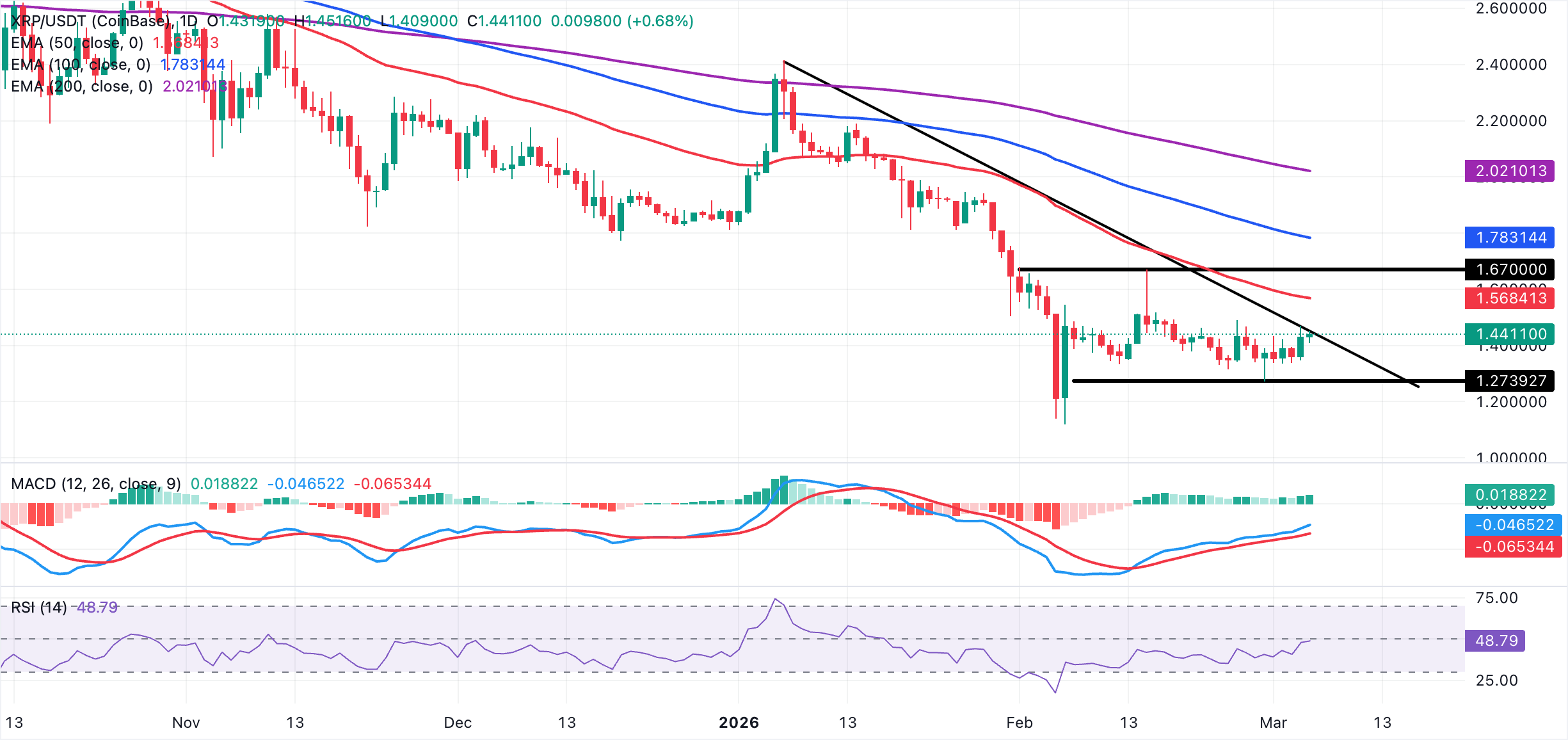 $XRP se mantiene por encima de 1.44$ mientras su perspectiva a corto plazo se torna ligeramente alcista, apoyada por un Índice de Fuerza Relativa (RSI) que aumenta gradualmente a 49 en el gráfico diario. El indicador de Convergencia/Divergencia de Medias Móviles (MACD) se mantiene por encima de su línea de señal en el mismo gráfico, con barras de histograma verdes en expansión. Si este caso alcista a corto plazo se mantiene, $XRP podría avanzar hacia la media móvil exponencial (EMA) de 50 días en 1.57$.