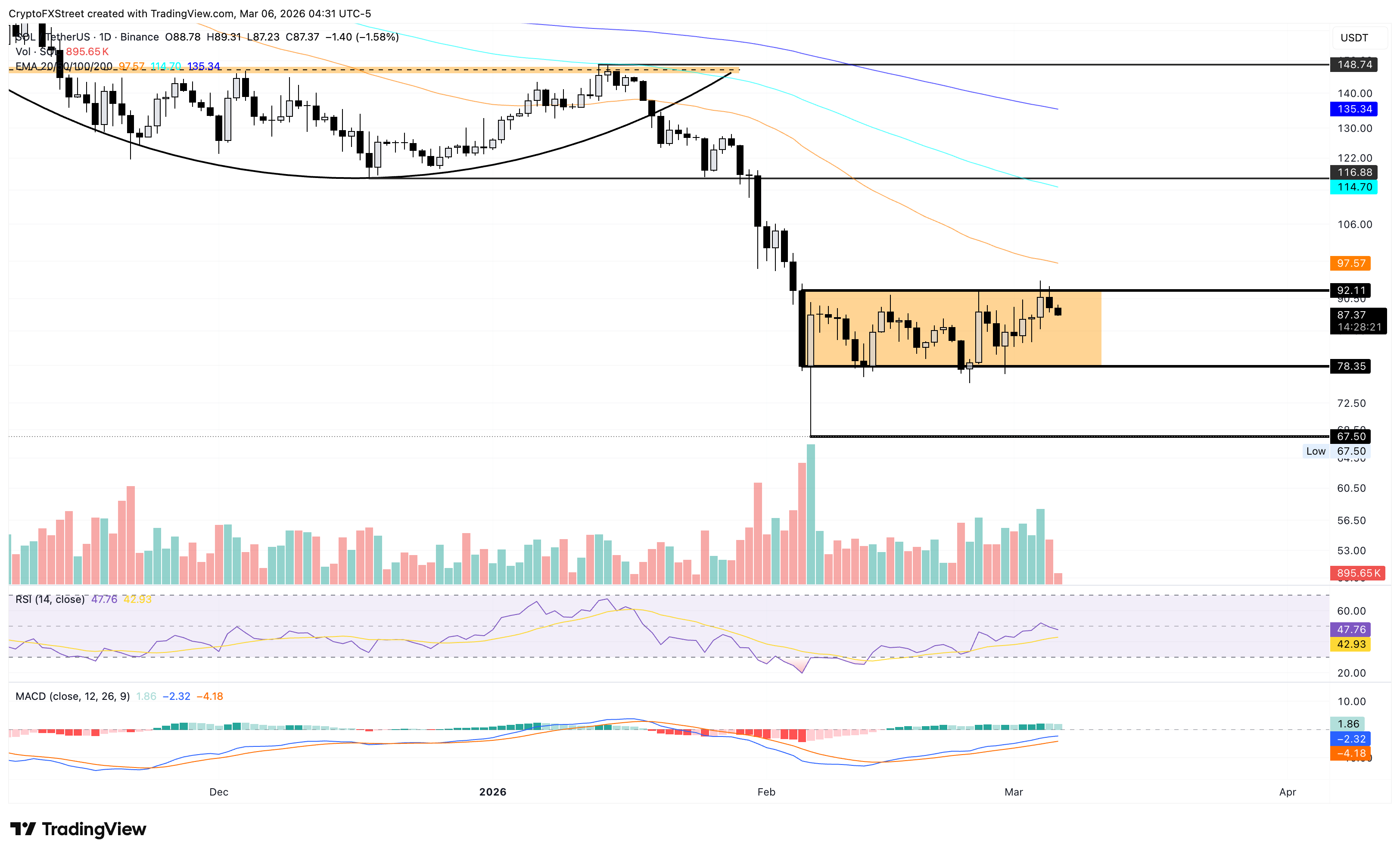 Solana se sitúa por debajo de 88,00$ en el momento de la publicación el viernes, extendiendo la pérdida del 2% del jueves. La perspectiva a medio plazo para Solana es ligeramente bajista, ya que cotiza por debajo de las medias móviles exponenciales (EMA) de 50, 100 y 200 días, que continúan limitando el alza.