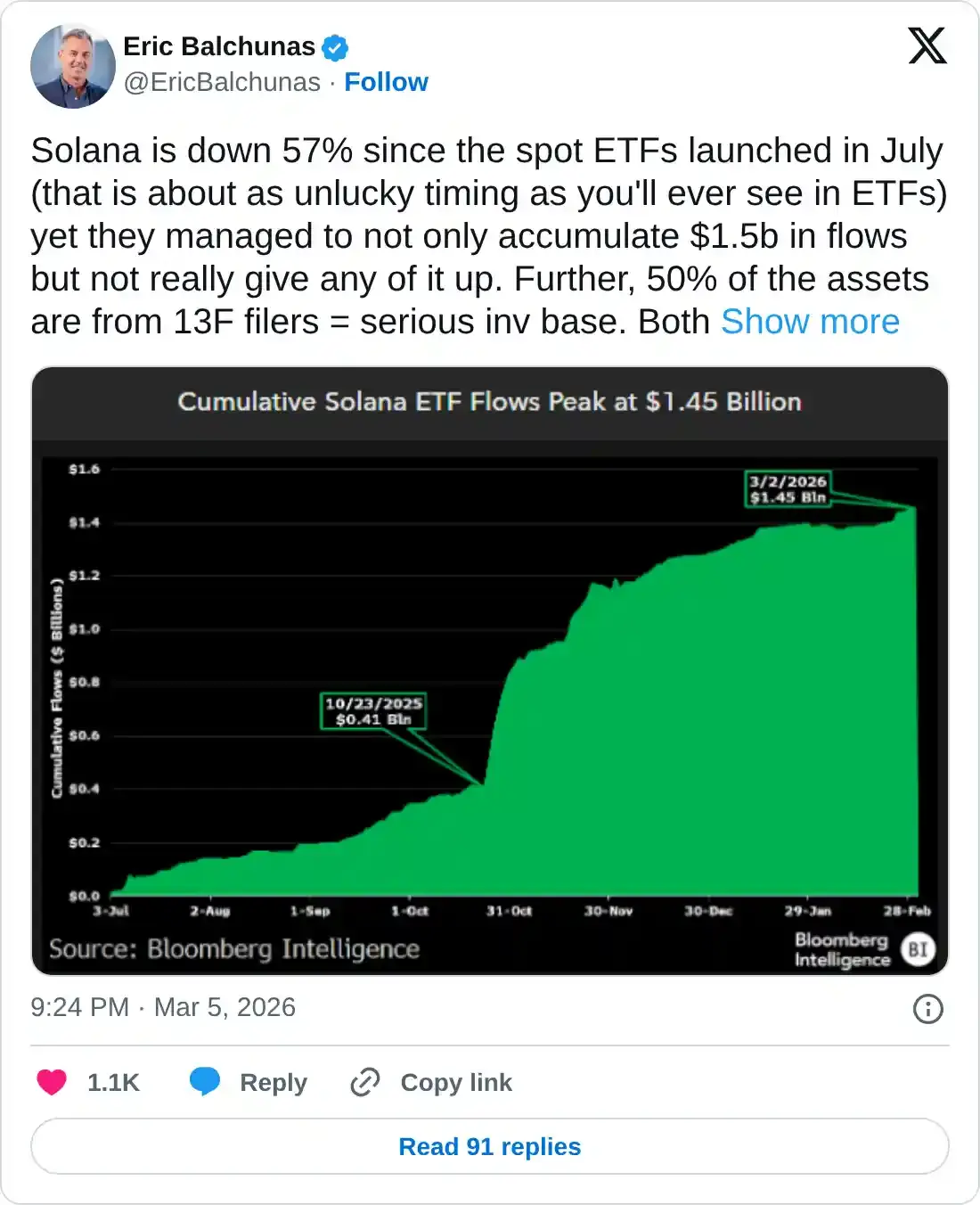 La demanda institucional por Solana sigue siendo fuerte desde el lanzamiento de ETFs centrados en $SOL en el mercado estadounidense. El analista de Bloomberg, Eric Balchunas, compartió recientemente en su cuenta de X que el aumento constante en los flujos acumulativos en los ETFs de Solana alcanzó un pico de 1.450 millones de dólares el martes, desde 410 millones de dólares el 23 de octubre.