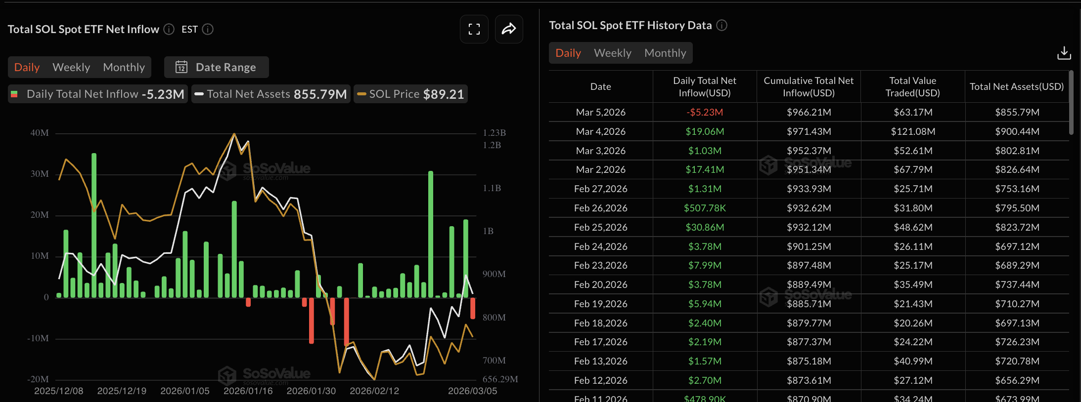 Mientras tanto, los flujos mínimos y ocasionales, como 5,23 millones de dólares el jueves, sugieren que los ETFs en gran medida retienen sus tenencias a pesar de que el precio de $SOL cayó por debajo de 100$.