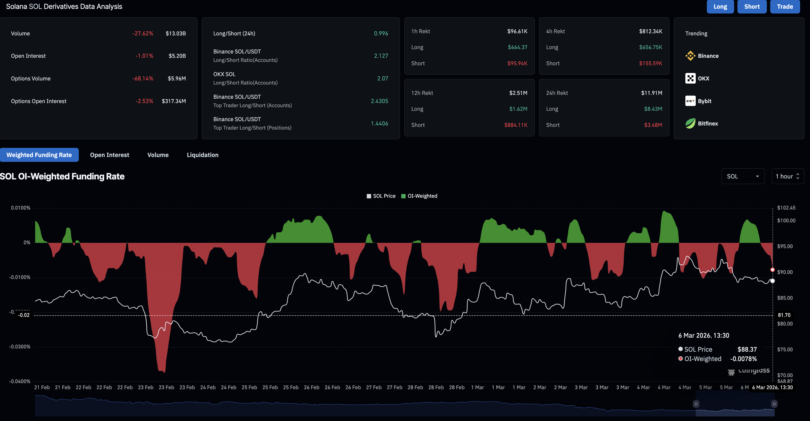Consistente con el desmantelamiento, el Interés Abierto (OI) de futuros de $SOL ha bajado un 1% en el mismo período, a 5.200 millones de dólares, indicando una disminución en la construcción posicional o exposición al apalancamiento a medida que se desvanece el apetito por el riesgo. Además, la tasa de financiación ha caído a -0,0078%, desde 0,0067% más temprano el viernes, reflejando un aumento agudo en el interés bajista entre los operadores.