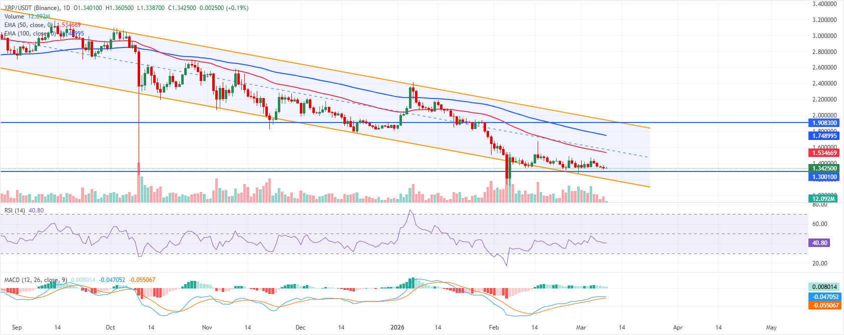El precio de $XRP cotiza a 1.34$ a partir del lunes, permanece atrapado dentro de un canal paralelo descendente desde por encima de 2.80$, manteniendo la tendencia bajista general a corto plazo a pesar del último rebote desde el límite inferior cerca de 1.20$. El precio se mantiene muy por debajo de las EMAs de 50 y 100 días agrupadas, que continúan inclinándose a la baja y limitan el alza.