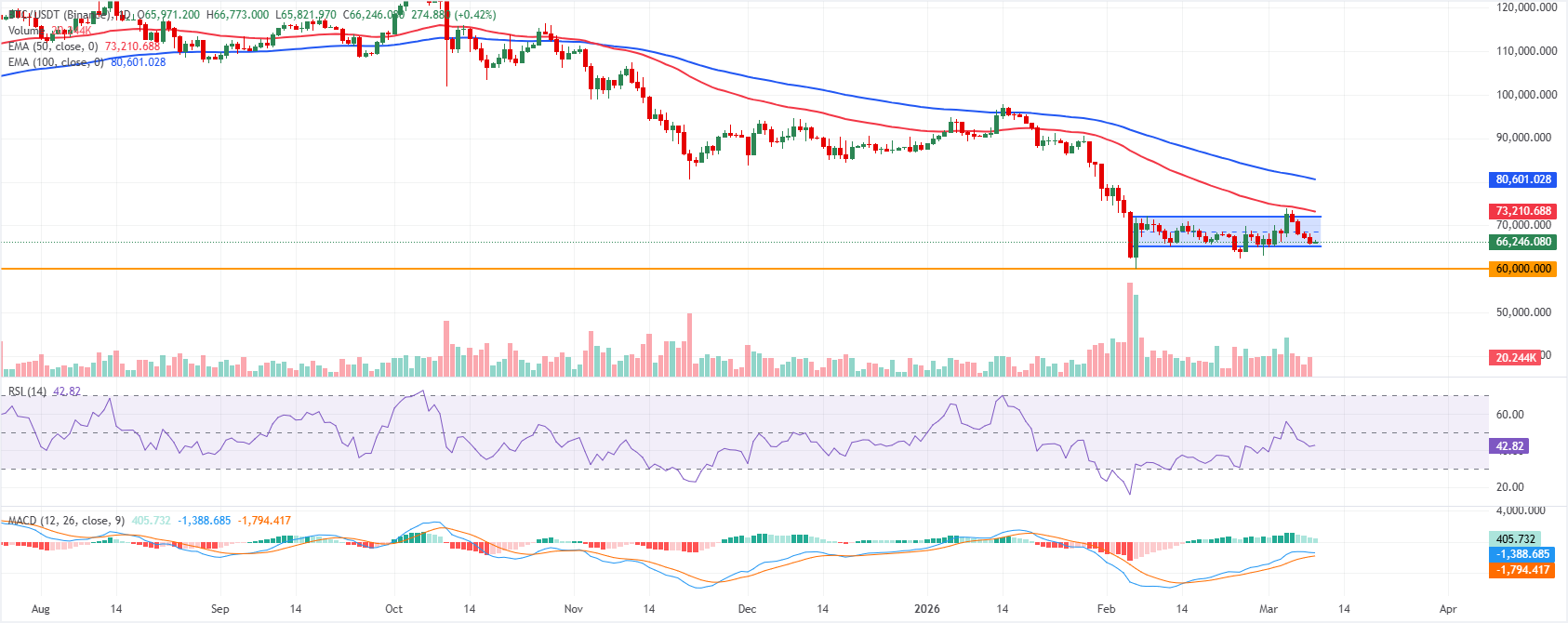 El precio del Bitcoin está cotizando a 66.300$ a partir del lunes. La tendencia a corto plazo se mantiene ligeramente bajista ya que el precio se mantiene dentro de un canal paralelo, cotizando más cerca del límite inferior después de no poder sostenerse por encima del área de 70.000$. El Rey de las Criptomonedas se mantiene muy por debajo de las EMAs de 50 y 100 días, que continúan inclinándose a la baja y limitan la tendencia general, subrayando la presión a la baja.