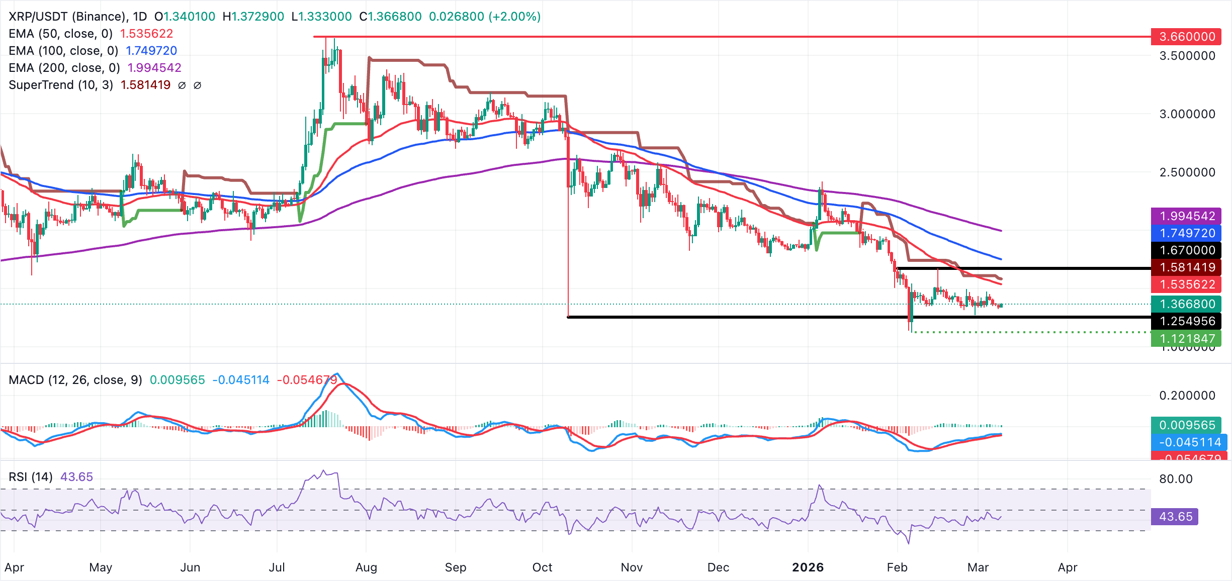 $XRP se cotiza a 1.36$, con el indicador de Convergencia/Divergencia de Medias Móviles (MACD) manteniéndose por encima de su línea de señal, indicando un impulso ligeramente alcista. Las barras de histograma verdes están expandiéndose nuevamente, lo que lleva a los operadores a aumentar su exposición. Mientras tanto, el Índice de Fuerza Relativa (RSI) en 43 indica un impulso por debajo de 50, consistente con un mercado que lucha por cambiar a alcista después de caídas prolongadas.