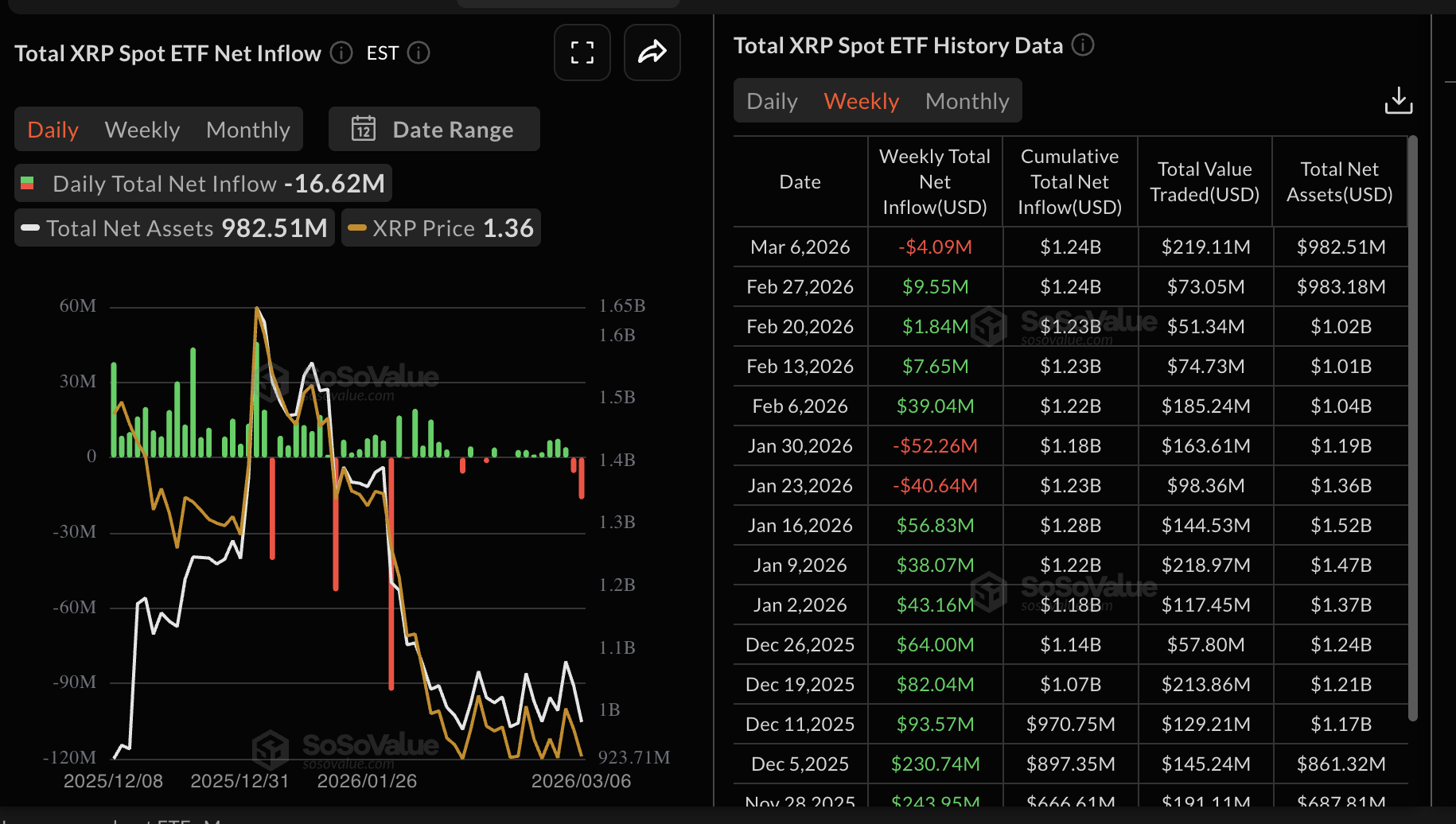 El interés en los fondos cotizados en bolsa (ETF) de $XRP también se ha enfriado, con salidas que totalizan 4 millones de dólares la semana pasada. A pesar de la disminución de la demanda, las entradas acumuladas se mantienen en 1.24 mil millones de dólares, y los activos netos son aproximadamente 983 millones de dólares.