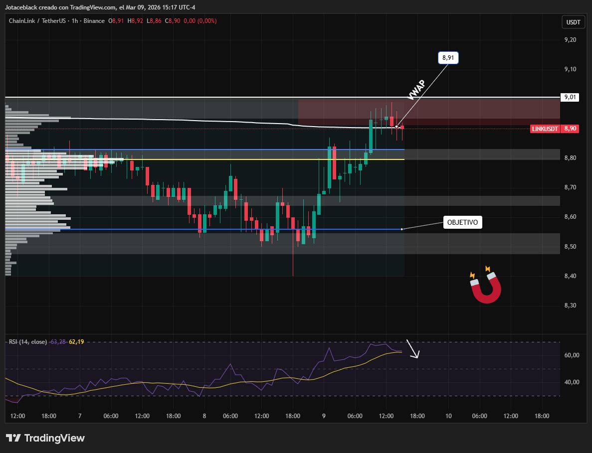 Desde el nivel actual, en torno a los $8,90, el precio muestra indecisión y rechazo en la zona de resistencia marcada por el VWAP, lo que sugiere una posible pérdida de impulso comprador. Este escenario abre la puerta a un retroceso en el corto plazo.