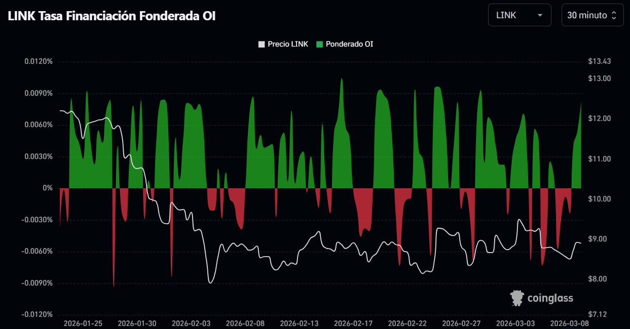 Sin embargo, el comportamiento más relevante aparece en el tramo más reciente, entre el 8 y el 9 de marzo, donde los funding rates se han mantenido en territorio positivo mientras el precio del activo comienza a recuperarse, pasando desde los $8,50 hacia niveles superiores.