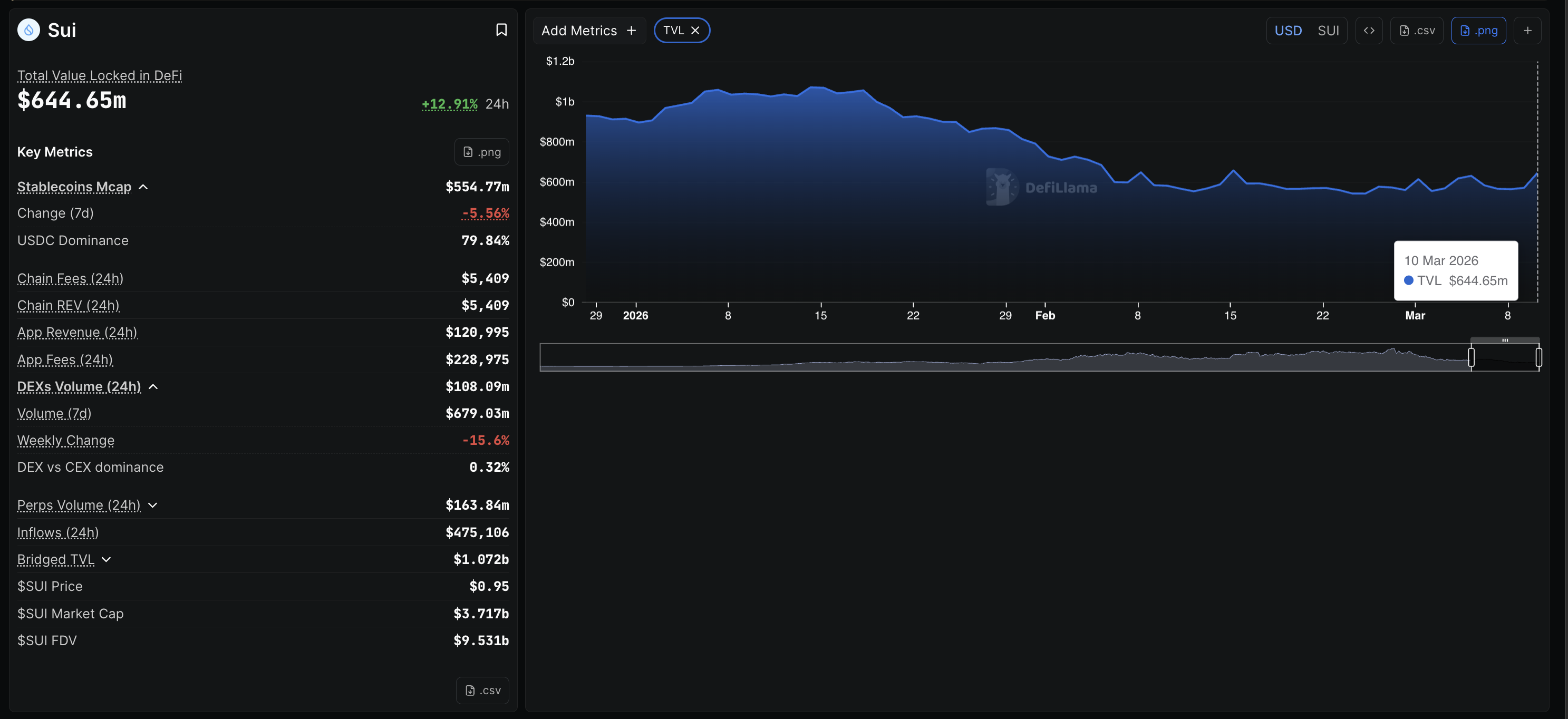 La demanda de Sui como una cadena de capa 1 está resurgiendo en medio de la afirmación de Donald Trump de que la guerra entre EE.UU. e Irán está cerca de su fin. Los datos de DeFiLlama muestran que el Valor Total Bloqueado (TVL) en Sui es de 644.65 millones de dólares, un aumento de casi el 13% en las últimas 24 horas, lo que indica un aumento en el flujo de capital en cadena ya sea a través de depósitos de usuarios o un aumento en el valor de los activos digitales depositados.