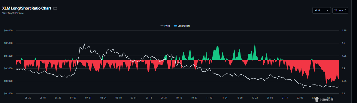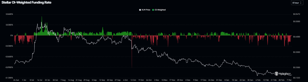 En el mercado de derivados, las tasas de financiación negativas de $XLM, junto con el aumento de las apuestas cortas, sugieren un panorama bajista. Los datos de la Tasa de Financiación Ponderada por OI de CoinGlass muestran que el número de operadores que apuestan a que el precio de Stellar caerá más es mayor que aquellos que anticipan un aumento de precios.