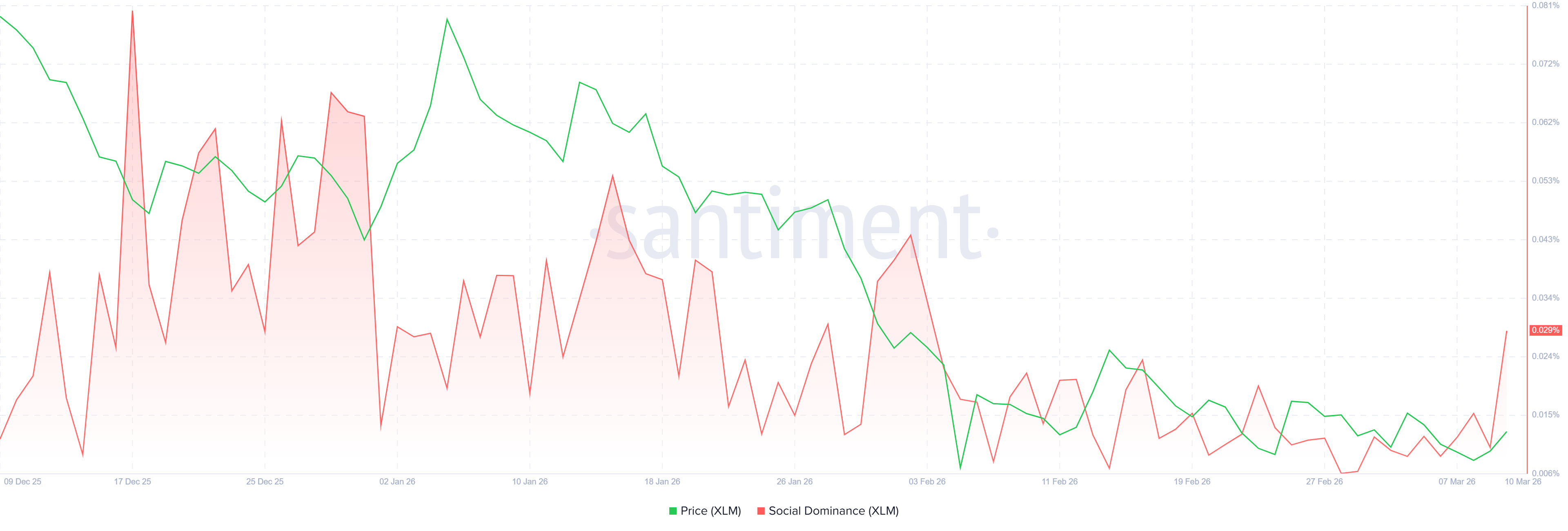 Los datos en cadena de Stellar muestran un panorama positivo. El índice de Dominancia Social de Santiment mide la participación de las discusiones relacionadas con $XLM en los medios de criptomonedas. Ha estado en tendencia ascendente desde finales de febrero, alcanzando el 0.029% el martes, el nivel más alto desde el 4 de febrero. Este aumento indica un creciente interés del mercado y un fortalecimiento del sentimiento entre los inversores de $XLM.