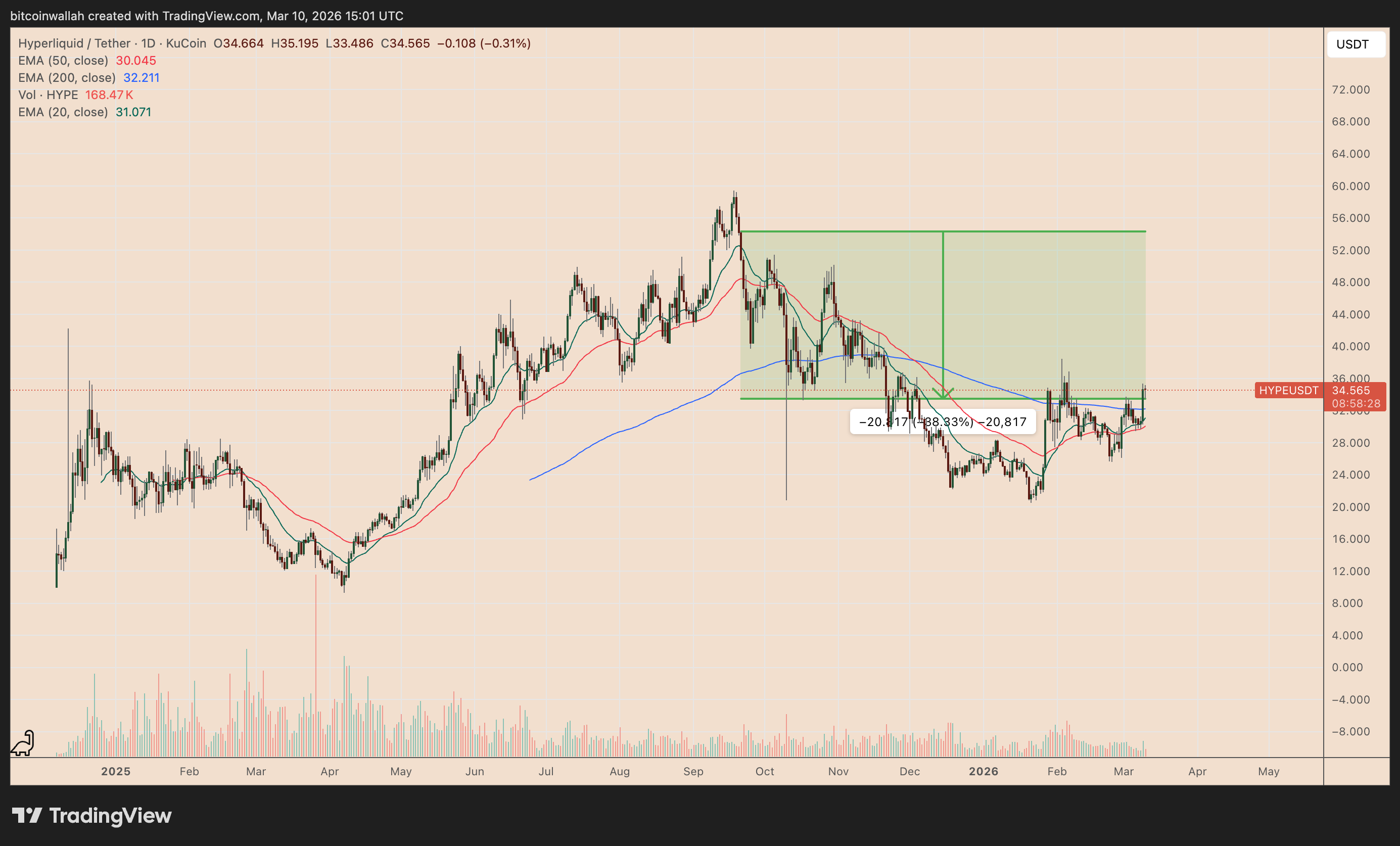 Por el contrario, un retroceso desde los USD 35,50 podría llevar inicialmente el precio de $HYPE hacia USD 30, un nivel que coincide con la línea de retroceso de Fibonacci del 0,236 y con la media móvil exponencial de 50 días (EMA de 50 días).