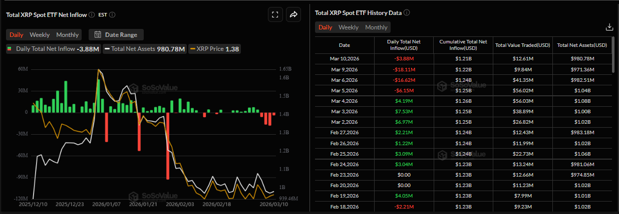 La demanda institucional de $XRP se mantuvo débil hasta ahora esta semana. Los datos de SoSoValue muestran que los ETFs al contado de $XRP registraron una leve salida de 3.88 millones de dólares el martes, marcando el cuarto día consecutivo de retiros desde el 5 de marzo. Si estas tendencias continúan e intensifican, $XRP podría ver una corrección en los próximos días.
