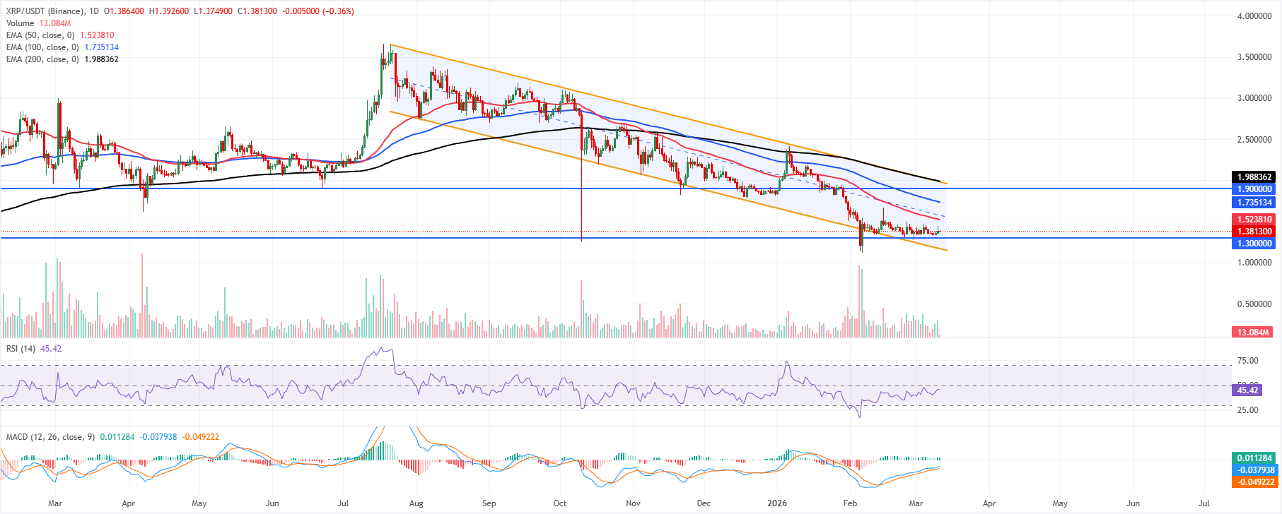 $XRP se negocia a 1.38$ el miércoles, con un aumento de casi el 3% hasta ahora esta semana, pero ligeramente a la baja en el día. $XRP se mantiene dentro de un canal paralelo descendente que ha guiado al mercado a la baja desde por encima de 2.80$, manteniendo el tono general a corto plazo bajista a pesar de la reciente estabilización por encima de 1.35.