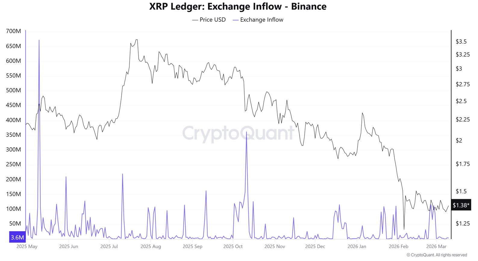 Además, los flujos de $XRP hacia Binance se han desplomado tras dos picos masivos el 10 de mayo y el 11 de octubre de 2025. Los flujos han caído a solo 3.62 millones de $XRP, desde un pico de 672 millones en mayo y 362 millones en octubre, lo que indica que la presión de venta en los intercambios ha disminuido significativamente.