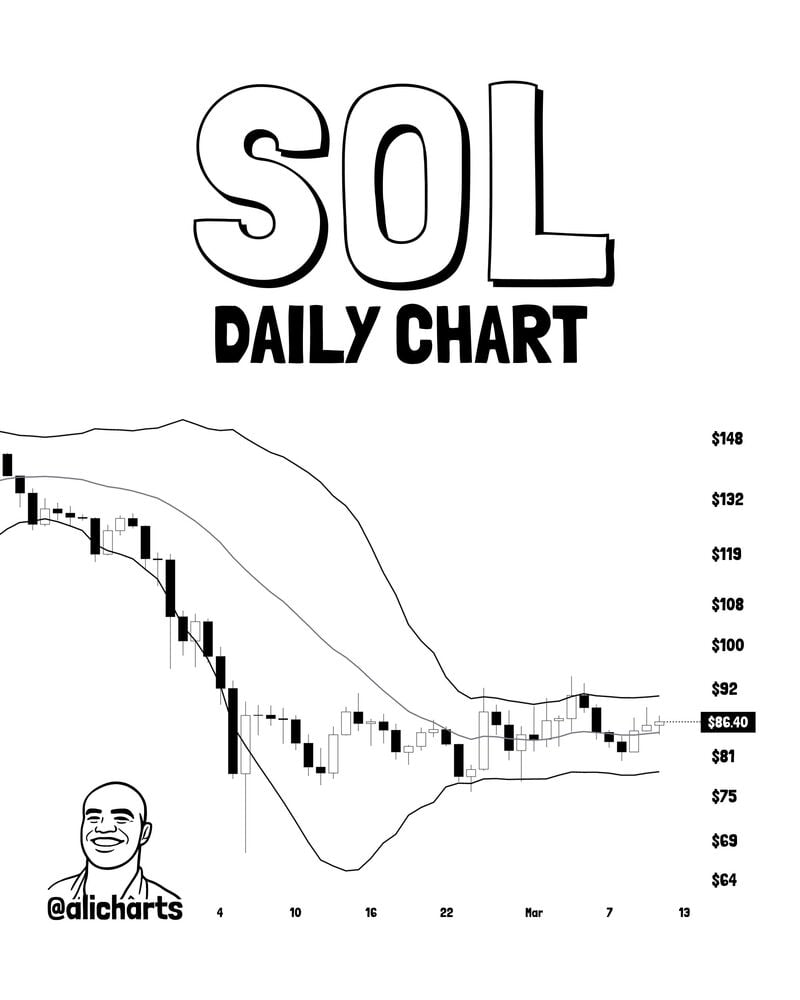 Solana se está consolidando actualmente en torno a los 85.9 dólares, lo que demuestra un aumento del 0.6% en las últimas 24 horas. Sin embargo, Martínez afirma que el precio de $SOL está cerca de experimentar un importante repunte, basado en la compresión de las Bandas de Bollinger en los gráficos diarios.