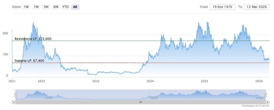 Solanacotiza en verde al mediodía del viernes en los 89.71 dólares. La media móvil de 70 periodos se mantiene encima de las últimas velas, RSI al alza en los 53 puntos y las líneas del MACD dirigiéndose por debajo hacia el nivel de cero.