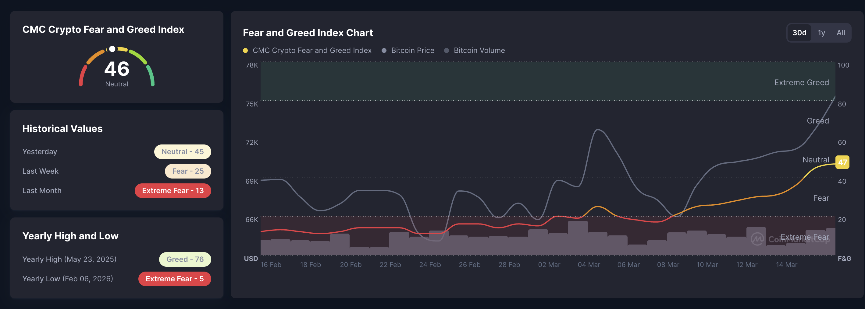 Mientras tanto, el sentimiento del mercado en general se está recuperando. El Índice de Miedo y Codicia de Cripto de CoinMarketCap sube a 46 el martes, sugiriendo condiciones neutrales.