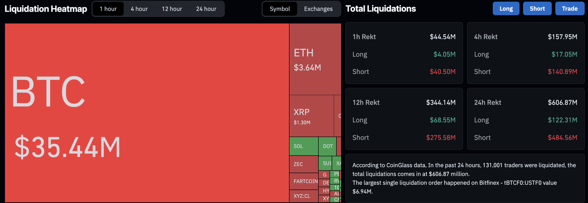 El repunte en el mercado de criptomonedas ha liquidado a 131.000 traders, totalizando 606 millones de dólares en liquidaciones en las últimas 24 horas, lideradas por 484 millones de dólares en liquidaciones cortas.
