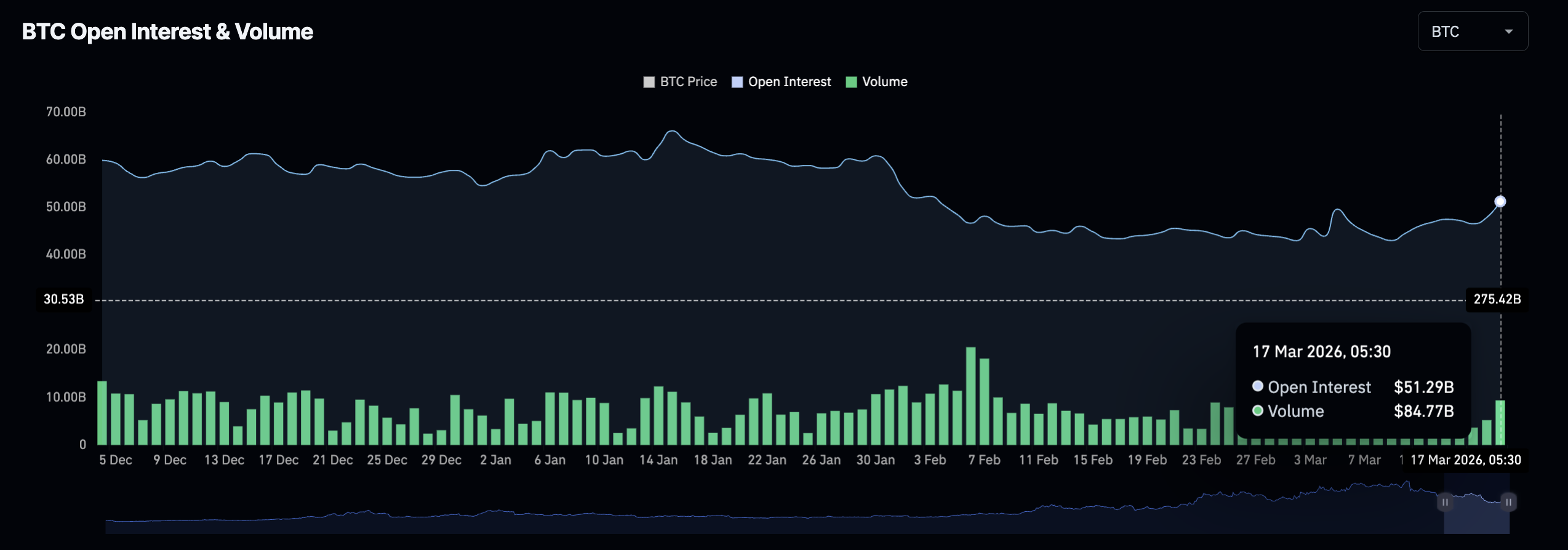 Consistente con la eliminación de posiciones bajistas, el Interés Abierto de futuros de Bitcoin (OI) está recuperándose, reafirmando un renovado sentimiento de riesgo. Los datos de CoinGlass muestran que el OI de $BTC ha aumentado a 51.29 mil millones de dólares desde 47.91 mil millones de dólares el lunes, sugiriendo una acumulación de posiciones o un aumento en el apalancamiento.