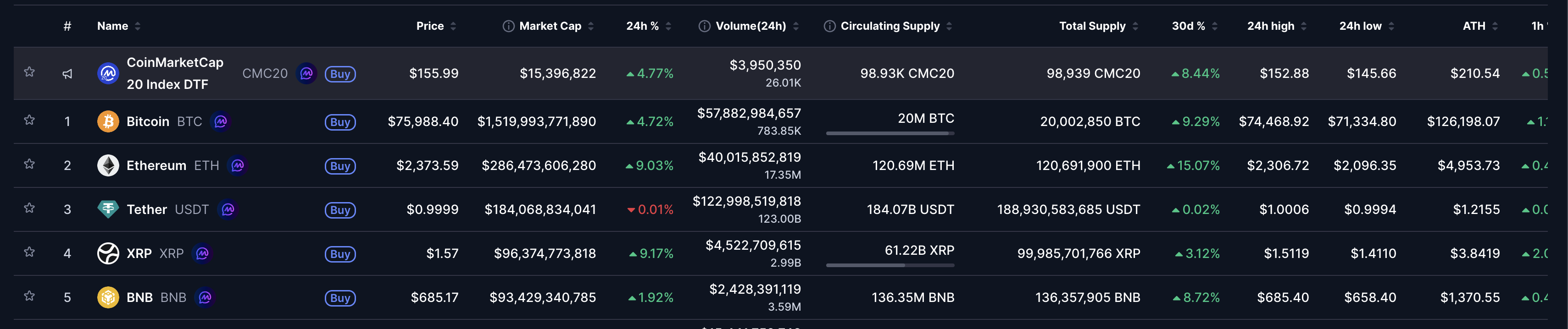 Bitcoin cotiza por encima de 75.000$ por primera vez desde el inicio de la guerra en Oriente Medio, elevando también a las altcoins. Al momento de escribir, Ethereum y Ripple están por encima de 2.300$ y 1.50$, respectivamente, el martes, con ganancias superiores al 9% en las últimas 24 horas, extendiendo la nueva recuperación.