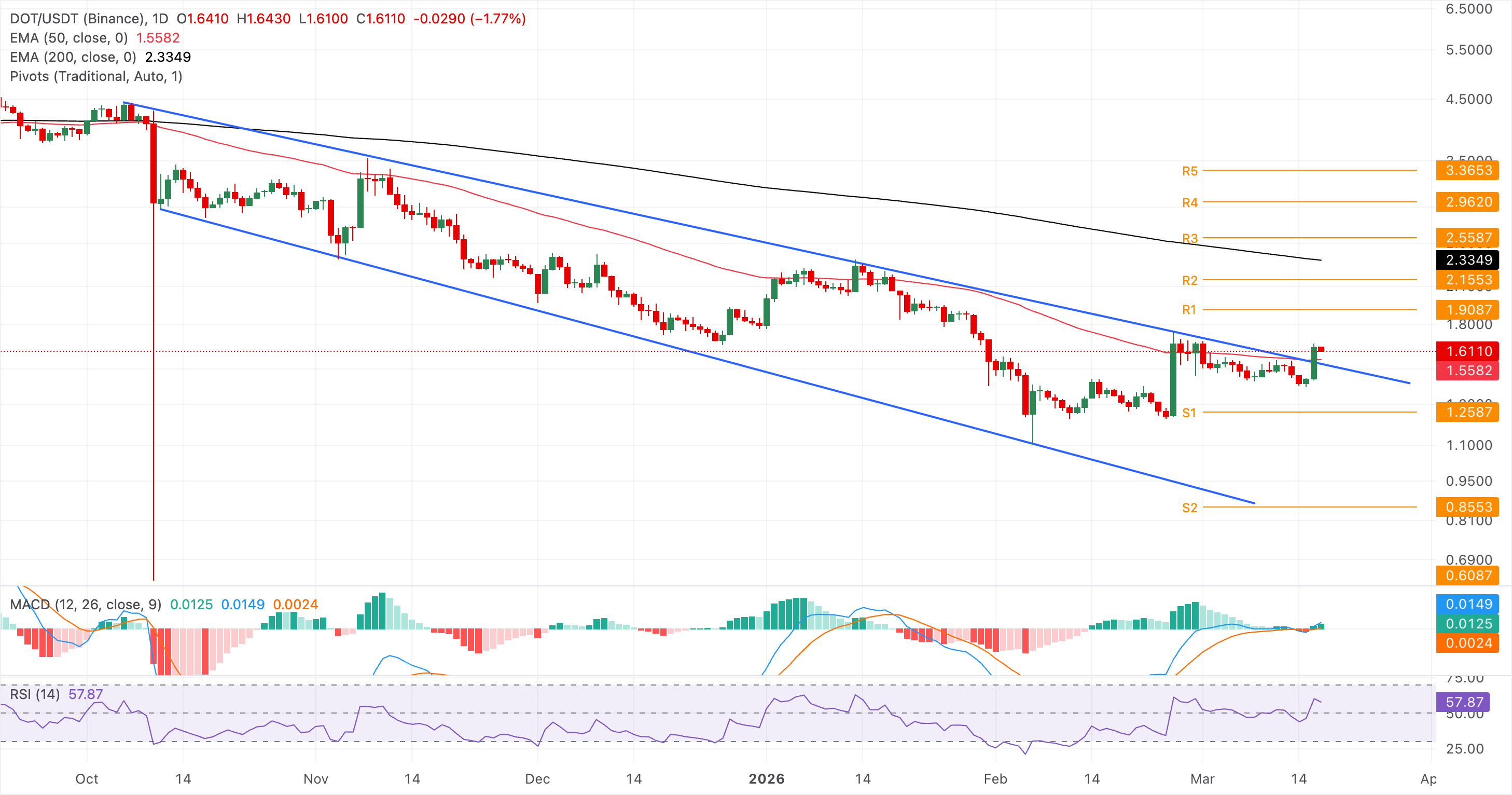 El objetivo al alza para $DOT sigue siendo el Punto Pivote R1 en 1.90$, mientras que los alcistas apuntan al nivel psicológico de 2.00$.