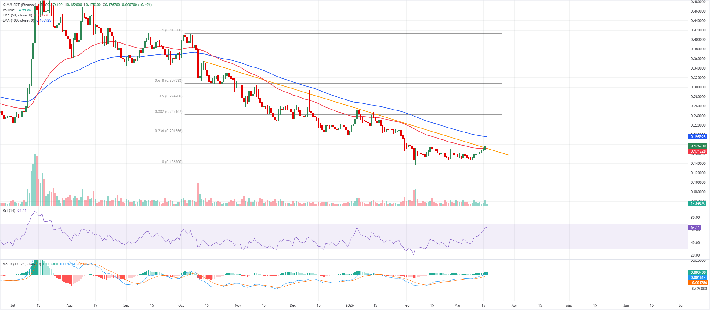 Perspectiva técnica de $XLM: $XLM cierra por encima de la línea de tendencia descendente