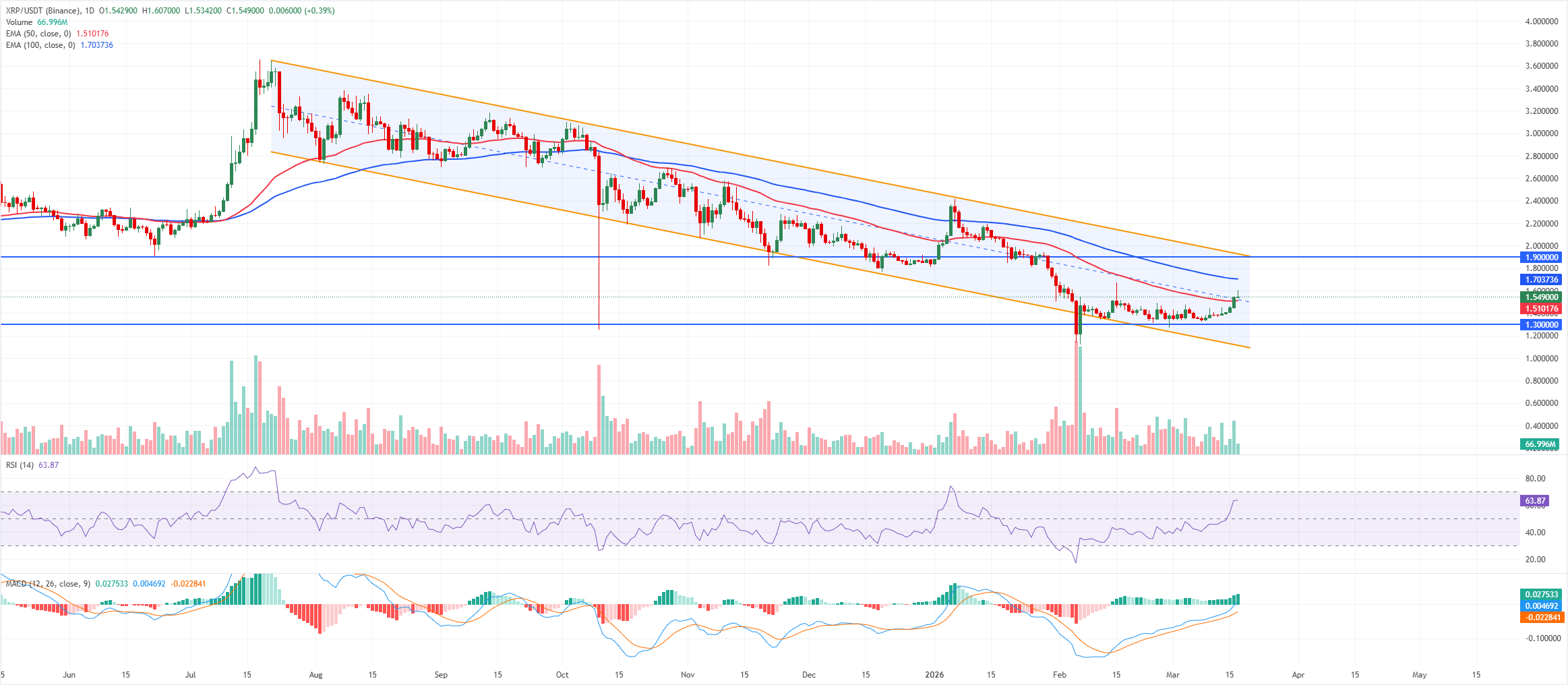 $XRP está cotizando a 1.54$ el martes después de haber subido más del 6% el día anterior. $XRP se negocia dentro de un canal paralelo descendente que comenzó por encima de 2.80$, pero el último rebote desde cerca del soporte de 1.30$ y el empuje por encima de los 1.40$ desplazan la tendencia a corto plazo a ligeramente alcista contra ese suelo. El precio ahora cotiza por encima de la media móvil exponencial (EMA) de 50 días mientras se mantiene por debajo de la EMA de 100 días, señalando una fase de recuperación temprana dentro de una estructura correctiva más amplia.