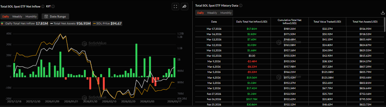 La demanda institucional por Solana comenzó la semana de manera positiva. Los datos de SoSoValue muestran que los ETF de $SOL al contado registraron una entrada de 17,81 millones de dólares el martes después de una entrada de 2,82 millones de dólares el día anterior. Las entradas positivas del martes marcaron el quinto día consecutivo de entradas desde el 10 de marzo, destacando el creciente interés de los inversores. Si esta tendencia de entradas continúa y se intensifica, $SOL podría ver un movimiento al alza en los próximos días.