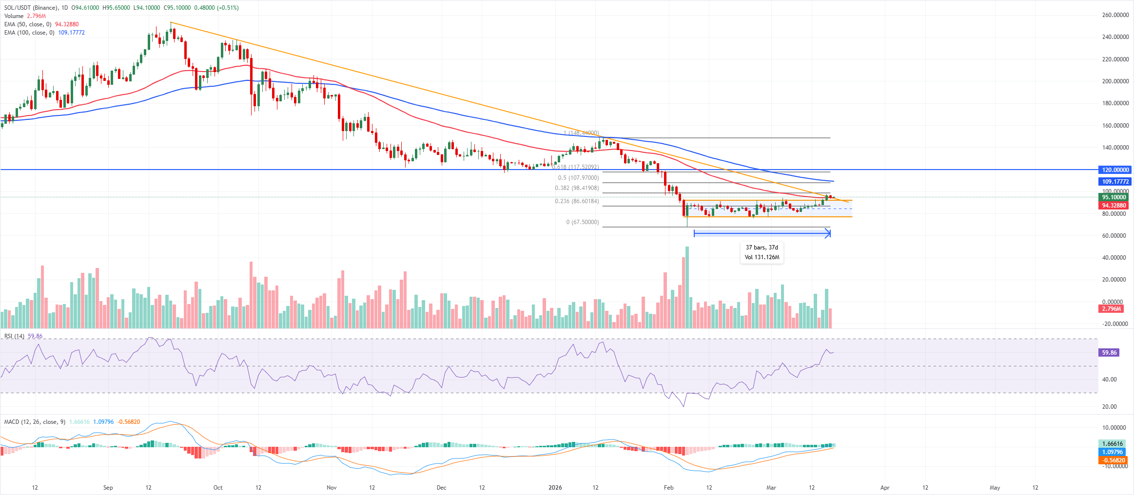 El impulso ha mejorado, con el Índice de Fuerza Relativa (RSI) en el gráfico diario manteniéndose cerca de 60 y la línea de Convergencia-Divergencia de Medias Móviles (MACD) permaneciendo por encima de su línea de señal en territorio positivo, lo que sugiere una presión al alza en fortalecimiento a pesar de que el precio de $SOL se mantiene por debajo de la Media Móvil Exponencial de 100 días en torno a 110$.