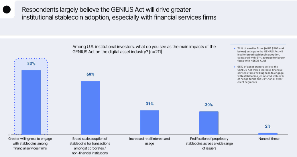 Parte de ese impulso está siendo impulsado por los desarrollos regulatorios estadounidenses, con el 83% de los encuestados diciendo que la aprobación de la Ley GENIUS aumentará la voluntad de las instituciones financieras de involucrarse con las stablecoins. Más de dos tercios (69%) dijeron que la ley impulsará una adopción más amplia de las transacciones basadas en stablecoins.