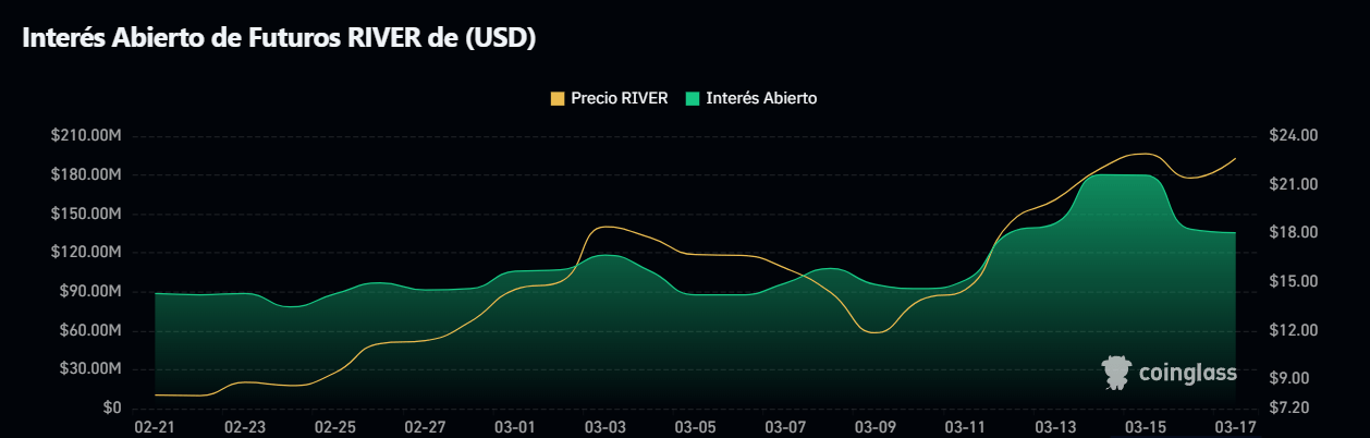 El gráfico del interés abierto de futuros de $RIVER muestra una expansión significativa en su tramo más reciente, pasando de niveles cercanos a los $90M–$100M hasta un pico próximo a los $180M, en paralelo con un fuerte impulso alcista del precio.