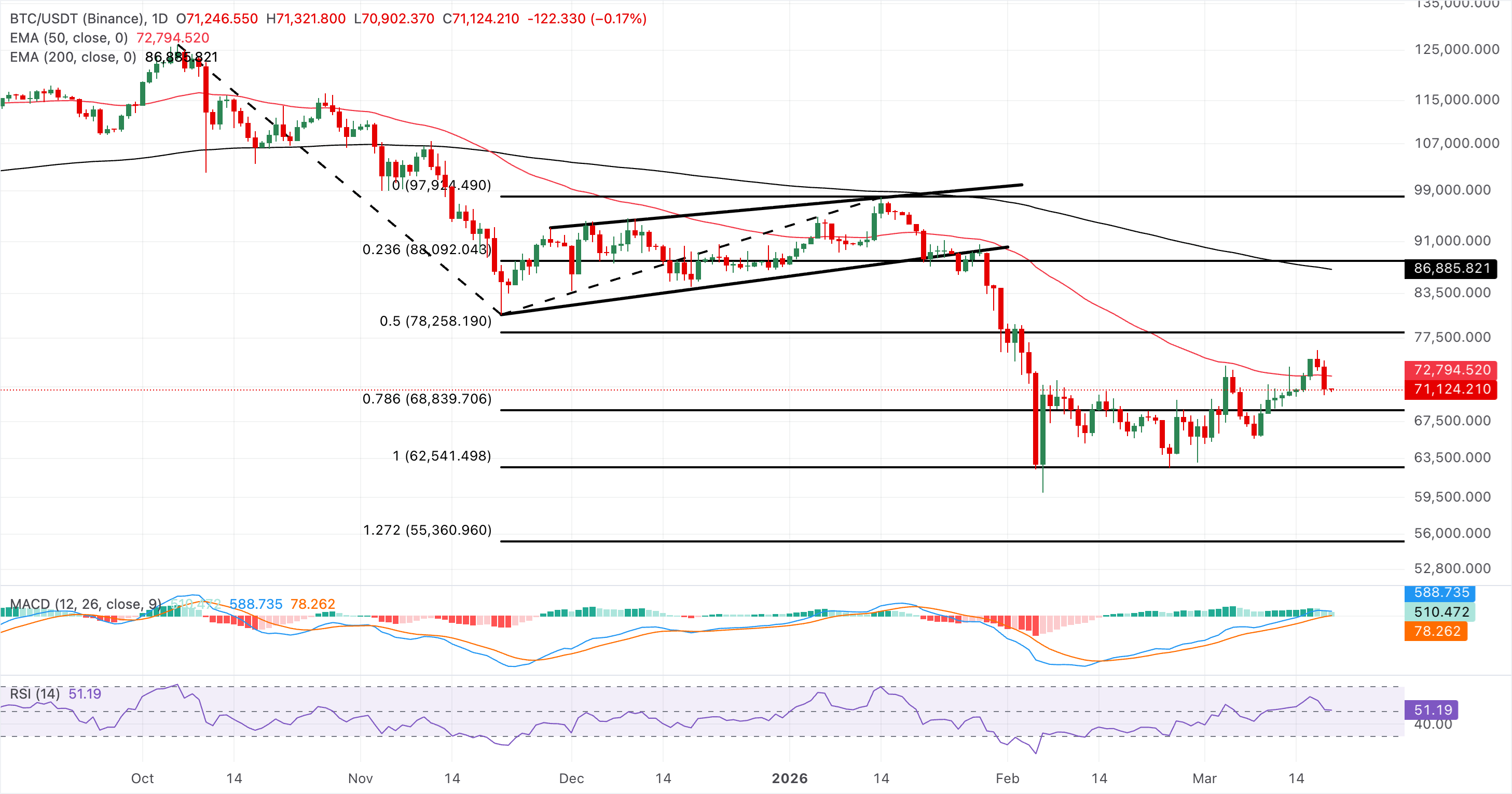 Para recuperar la tendencia alcista, Bitcoin debería asegurar un cierre diario por encima de la EMA de 50 días en 71.089$, lo que podría extender el movimiento al alza hasta el retroceso del 50% en 78.258$.